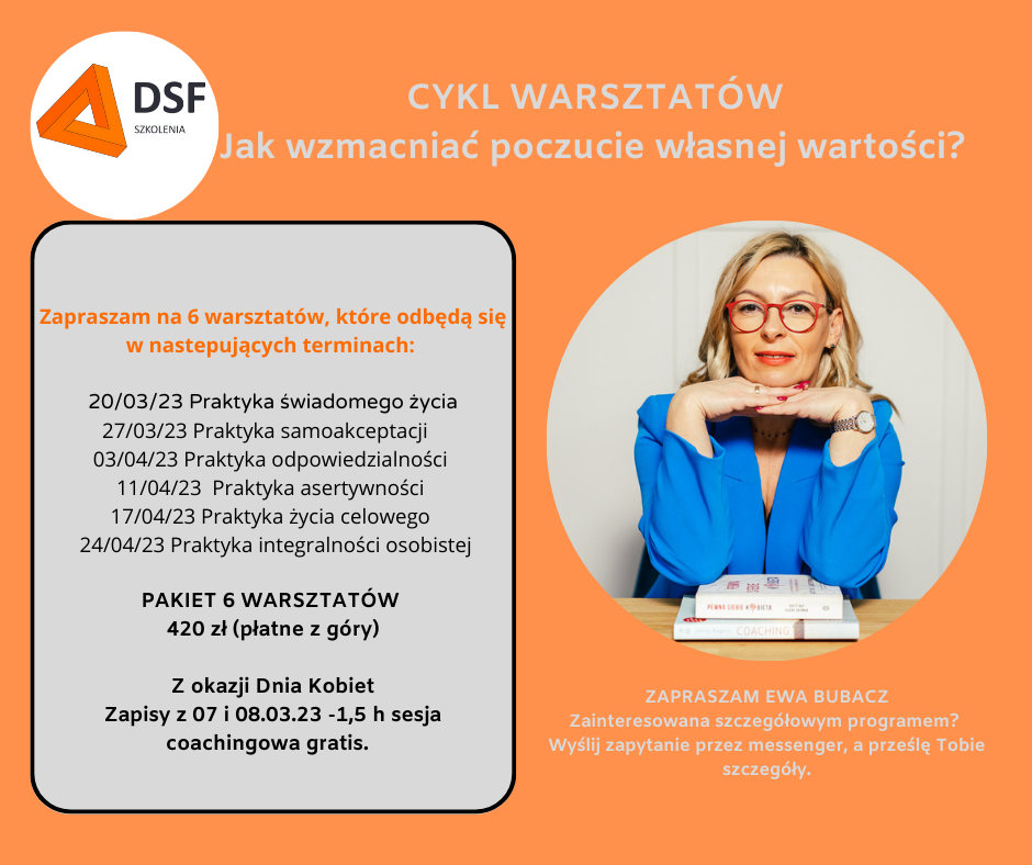Zapraszam na te warsztaty. Każde spotkanie, to dawka wiedzy i treningu. Czas każdego spotkania, to 2 h. Miejsce: Pobiedziska Biuro DSF Szkolenia ul. Królowej Jadwigi 9/1 Jeśli jesteś zainteresowana szczegółowym programem, wyślij wiadomość na messenger lub wypełnij formularz na stronie, a wrócę do Ciebie z informacją zwrotną:).